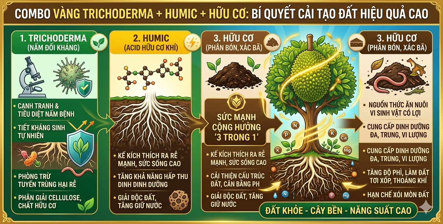 | 2. Tái tạo | 7–20 ngày | Trichoderma + Hữu cơ + Humic | Xây dựng hệ vi sinh |