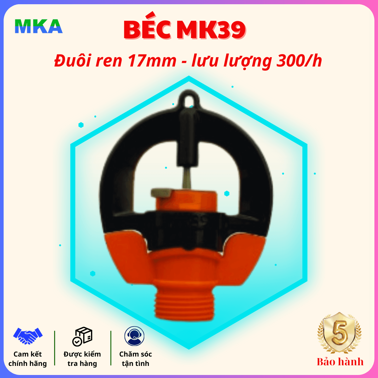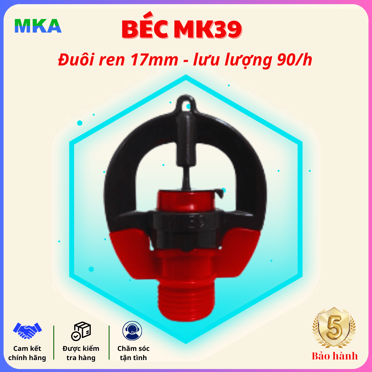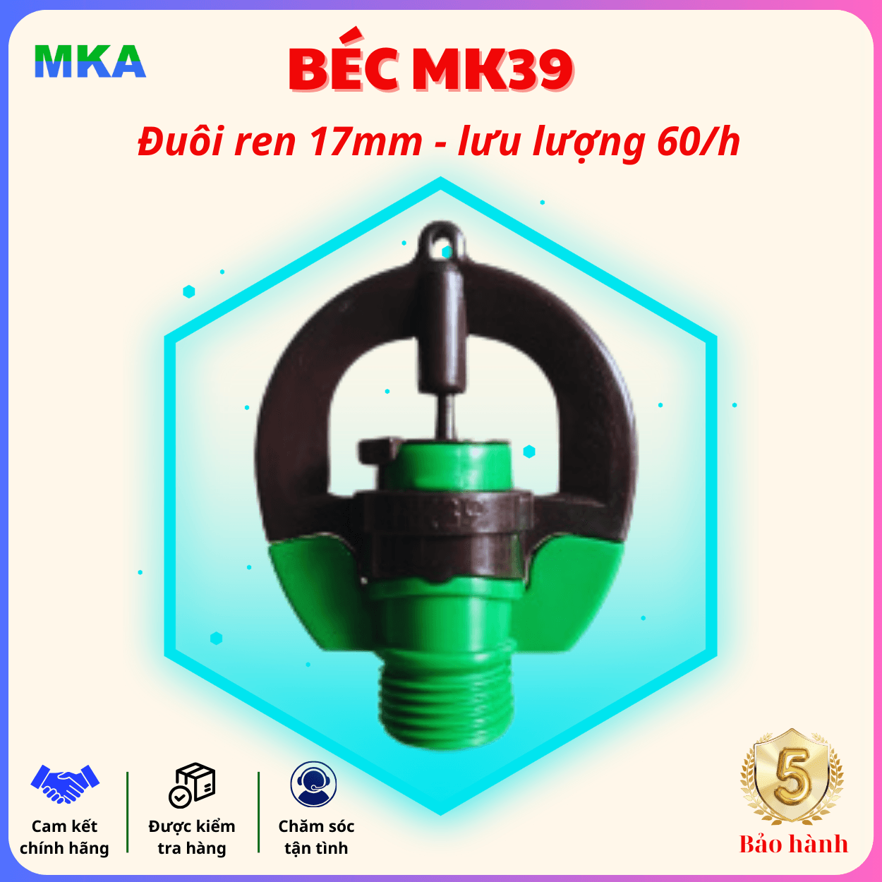 - Bền bỉ và bảo hành lâu dài: Béc tưới MK39 được bảo hành trong 5 năm.