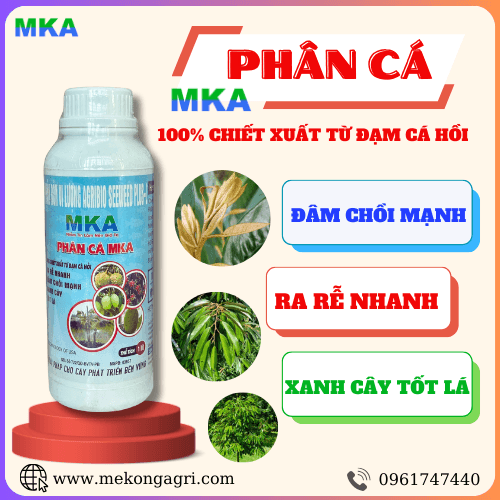 Phân Cá MKA là sản phẩm phân bón hữu cơ dạng lỏng, được chiết xuất từ tinh chất đạm cá hồi, bổ sung vi lượng thiết yếu cho cây trồng, giúp kích thích ra rễ, bung chồi, giải độc phèn, phục hồi cây sau thu hoạch và nuôi trái to, bóng đẹp.